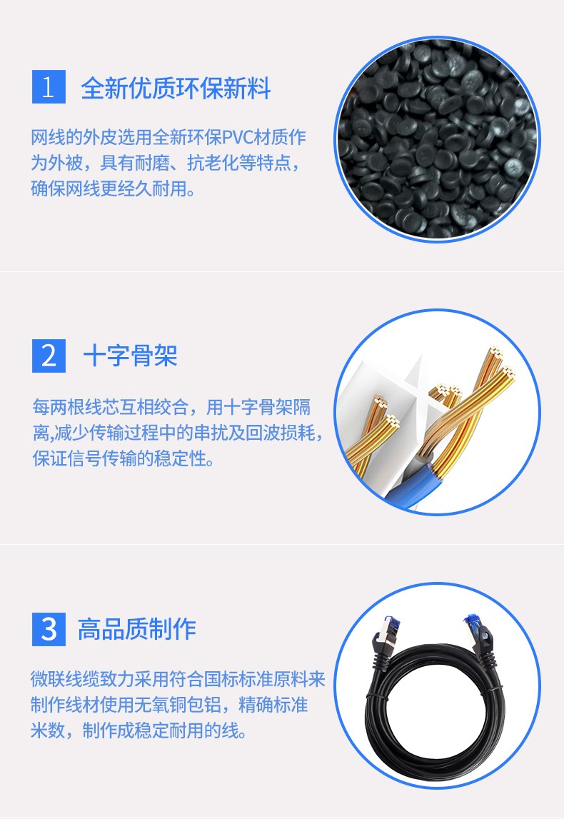 【品牌】:微联【品名】:六类千兆屏蔽网线【线长】:0.5-100米【线芯】:24AWG【对数】:8芯4对双绞【外被】:环保PVC料【颜色】:黑色【适用】:台式机/笔记本/路由器/电视盒子等